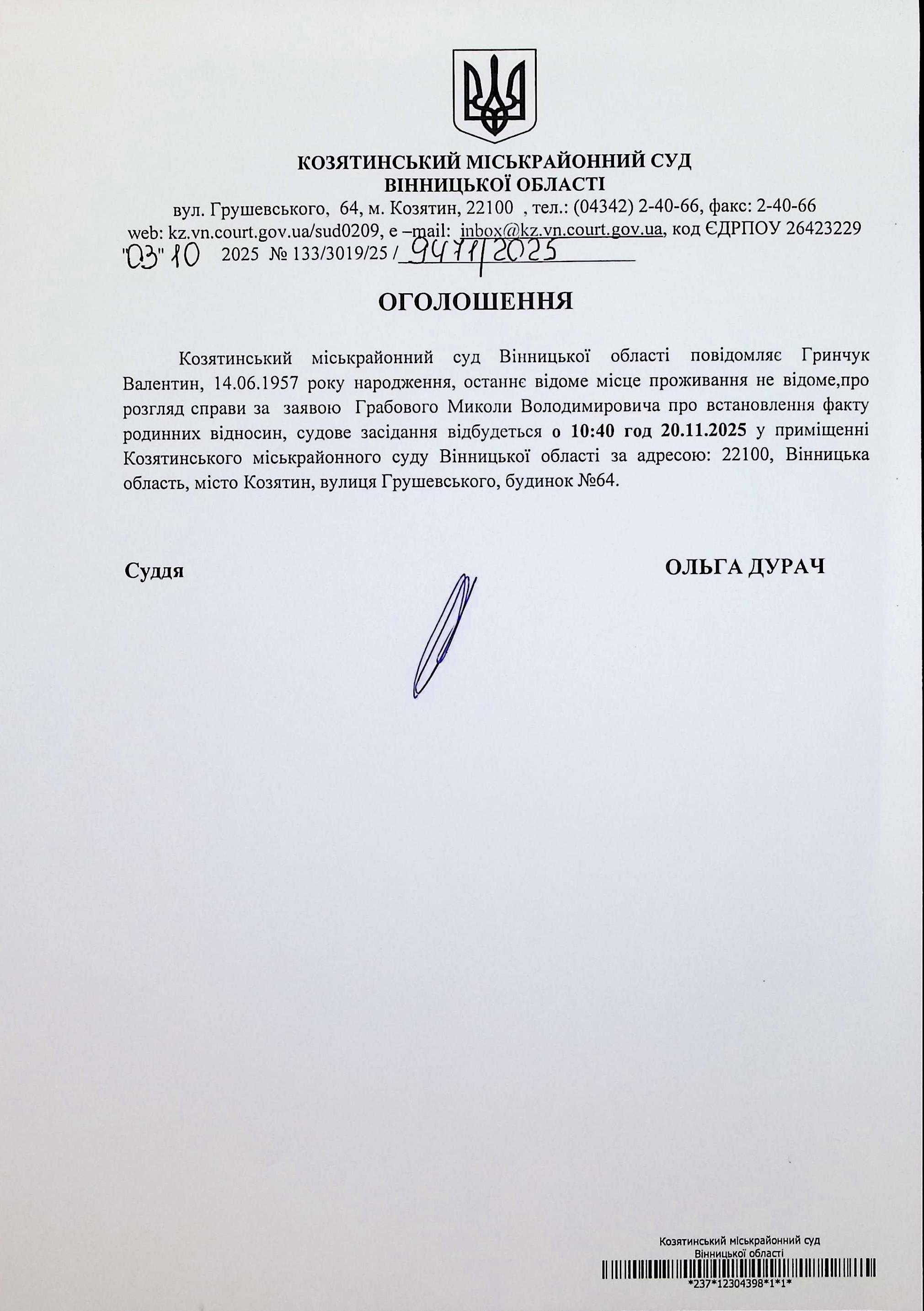 ОГОЛОШЕННЯ для Богуславської А.О.